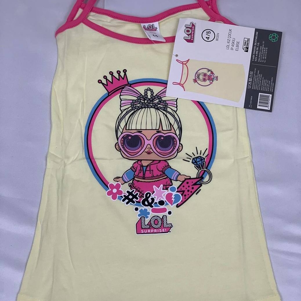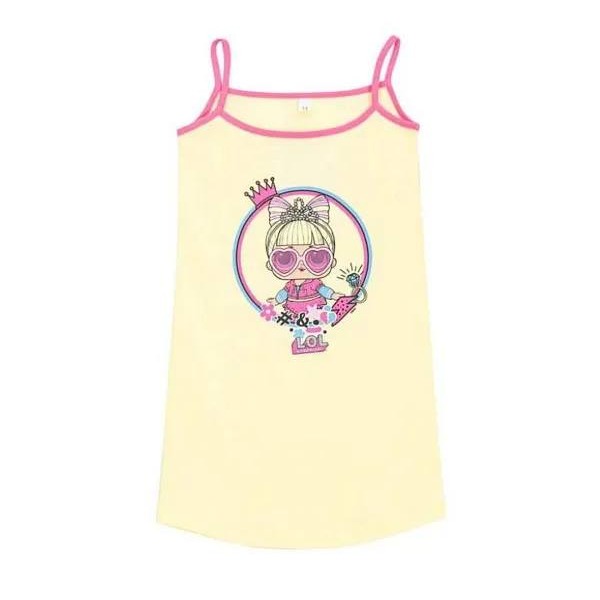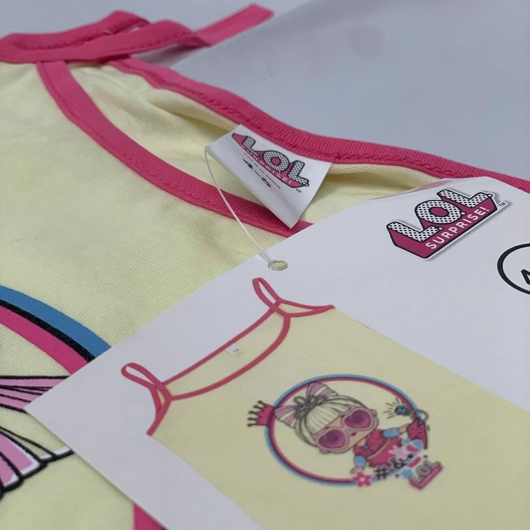 Маечка желтого цвета на тонких бретелях. Спереди нарисованы 1 куклы Лол и надпись "LOL". Приятная на ощупь, хорошо тянется