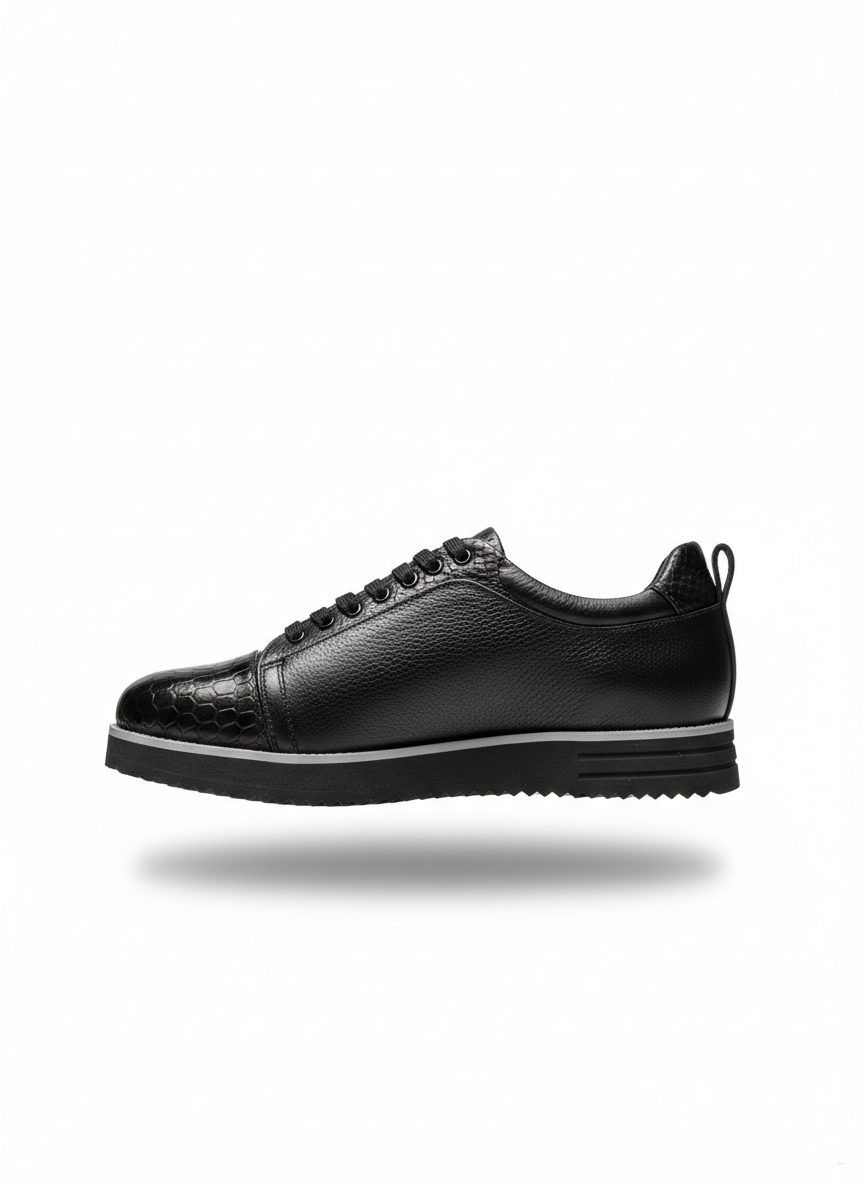 • Комбинация фактур — зернистая кожа + текстура рептилии для премиального вида