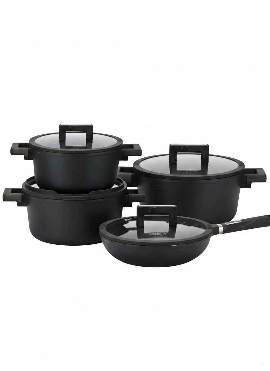• Количество — 3 кастрюли, 1 сковорода, 4 стеклянные крышки