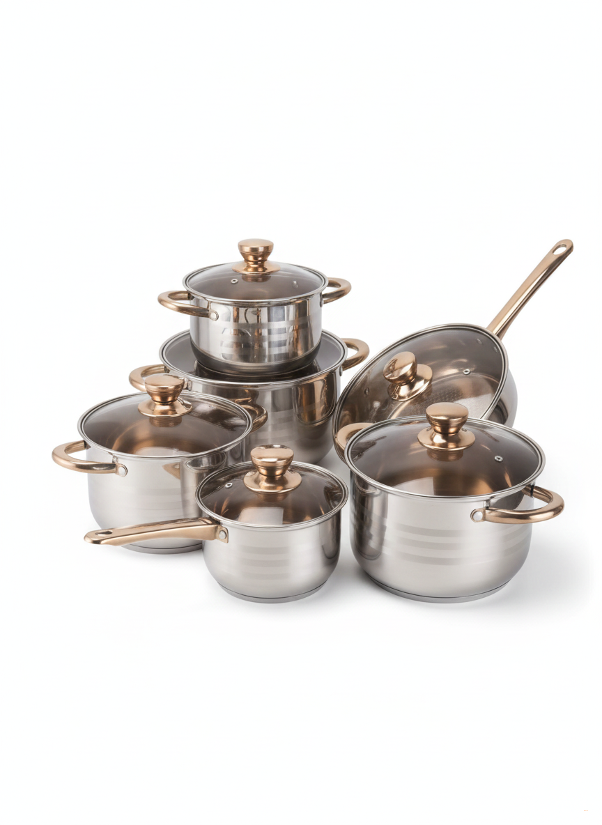 • Материал — нержавеющая сталь, ручки под золото/медь