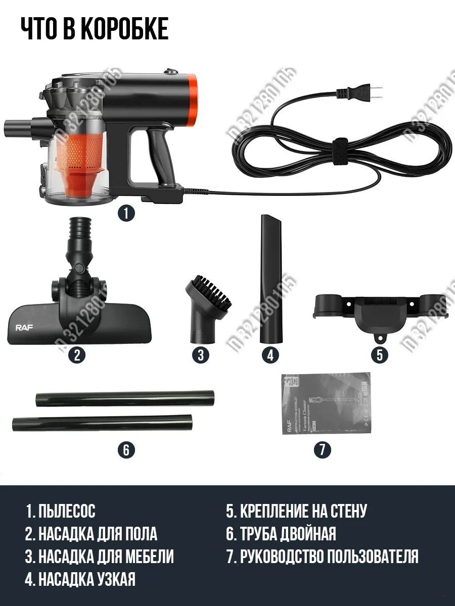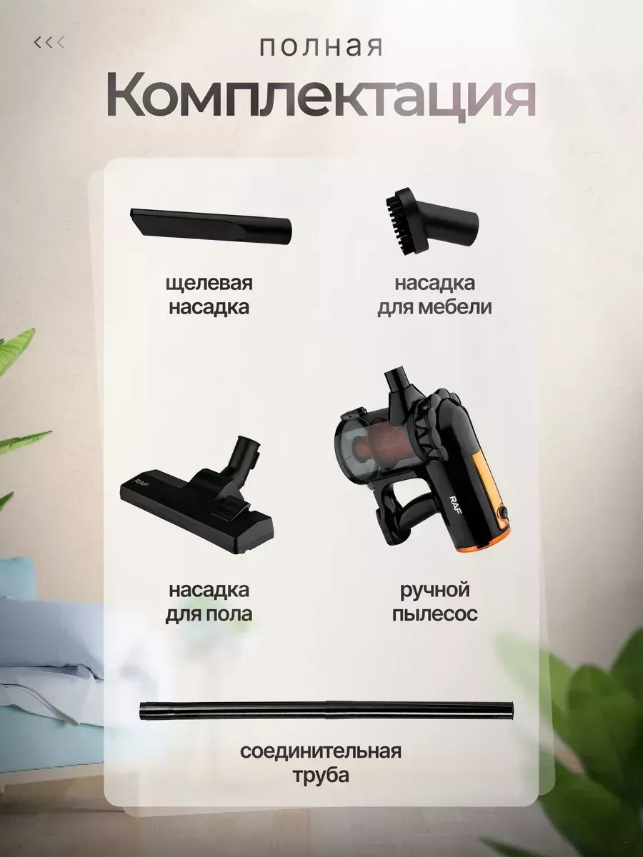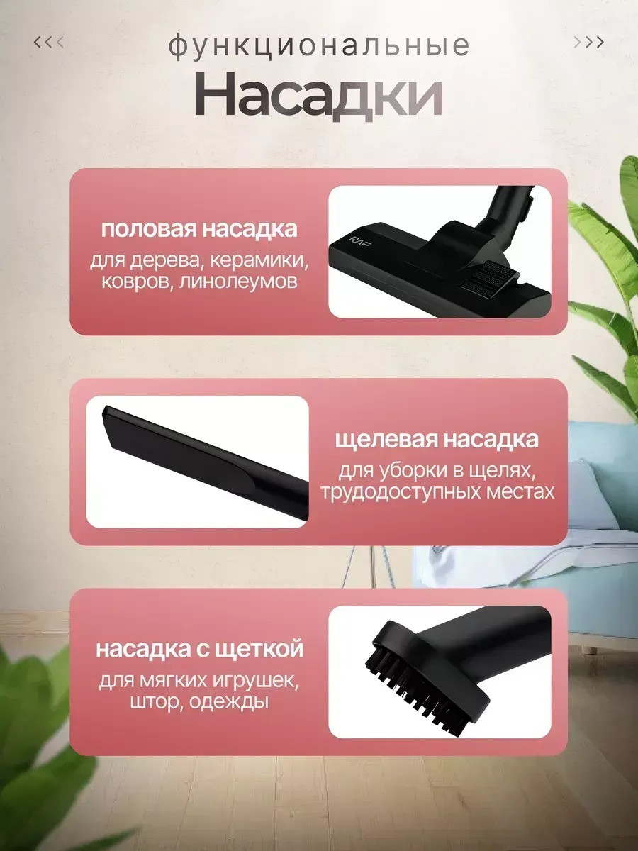 • Насадки в комплекте — для ковров, твёрдых поверхностей, щелевая